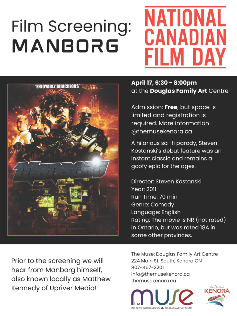 Join The Muse in celebrating National Canadian Film Day with a free screening of Manborg, the hilarious cult sci‑fi parody that has earned legendary status among genre fans. Before the lights go down, audiences will hear from “Manborg” himself—local filmmaker Matthew Kennedy of Upriver Media—adding a special hometown connection to the evening.