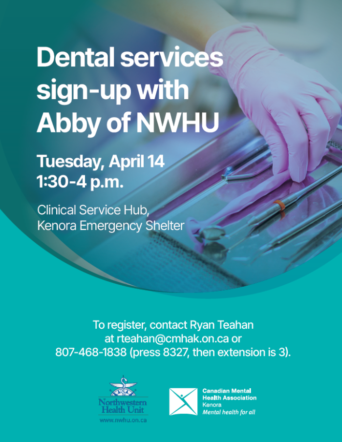Dental Services sigh-up with Abby from the Northwestern Health Unit. On Tuesday, April 14, from 1:30-4pm at the Clinical Service Hub, Kenora Emergency Shelter. To register, please contact Ryan, 807-468-1838 […]