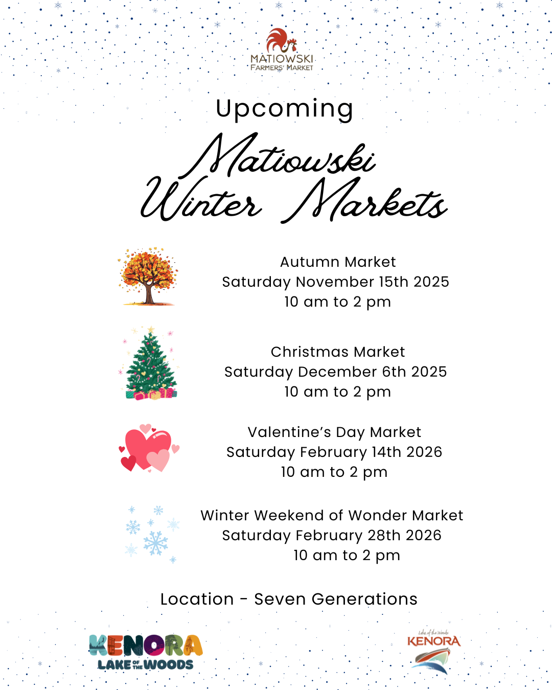 The Matiowski Winter Markets feature many farmers' market favourites during the off season at a smaller scale indoors. Visit the winter markets leading in to Christmas, Valentine's Day and during Winter Weekend of Wonder in 2026. For inquiries; contact Matiowski Farmers' Market Coordinator, Helena Devins at hdevins@kenora.ca or 807-467-4637.
