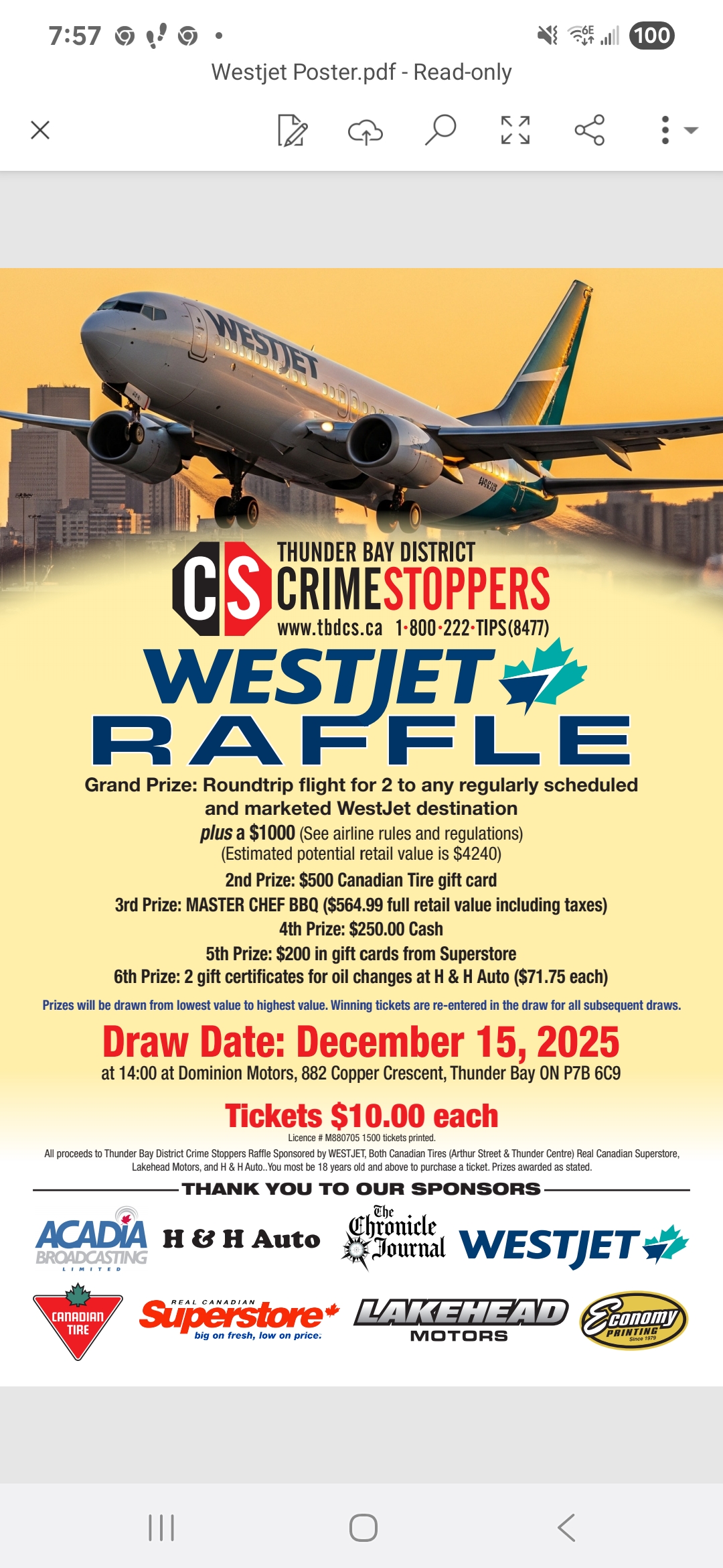 Thunder Bay District Crime Stoppers will be having a raffle draw on the 15th of December, 2025 at 2pm at Dominion Motors. Ticket are $10.00 each Tickets are available at […]