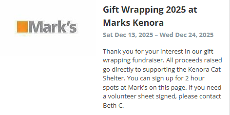 Our annual Christmas wrapping event on at Mark's Work Wearhouse and Canadian Tire from now until Christmas eve. You can sign up through the link on our Facebook page under […]