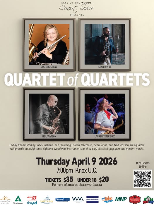 Lake of the Woods Concert Group presents “Quartet of Quartets” on Thursday, April 9th at Knox United Church in Kenora.