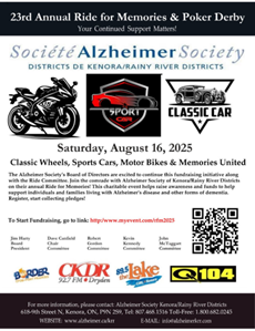 Motorcycle and classic car ride supporting the Alzheimer Society of Kenora/Rainy River Districts. Riders from Red Lake, Kenora, Atikokan, and Rainy River converge in Dryden for lunch at the Dryden Legion, carry on with the parade to Ignace. Then finish off the day with evening dinner and ceremony in Dryden.