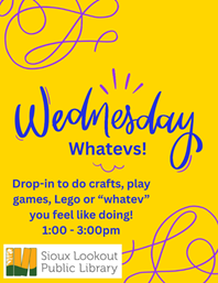 Every Wednesday you can drop-in at the public library, do some crafts, read, Lego, or “Whatevs!” Sioux Lookout Public Library 1-3pm every Wednesday.