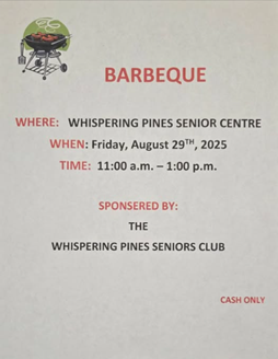 Whispering Pines Seniors Club BBQ – Aug 29th, 11-1pm