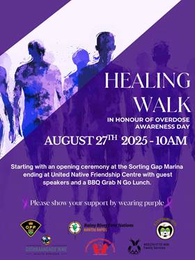 The Overdose Awareness Healing Walk that is taking place on Thursday, August 27th starts at the Sorting Gap Marina in Fort Frances. The opening ceremony will be at the marina at 10am with the Awareness Walk ending at The United Native Friendship Centre on Mowat Avenue where a BBQ grab-and-go-lunch will be served.
