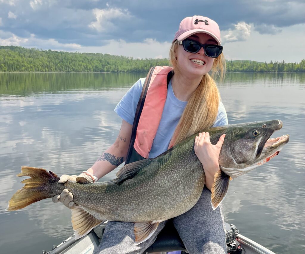 Maddi had just masterfully wrestled a new Personal Best, 42 inch / 30 lb. Lake Nipigon Lake Trout to the boat… a fish of a lifetime… eclipsing her 12 lb. previous best Laker by 18 lbs!!!